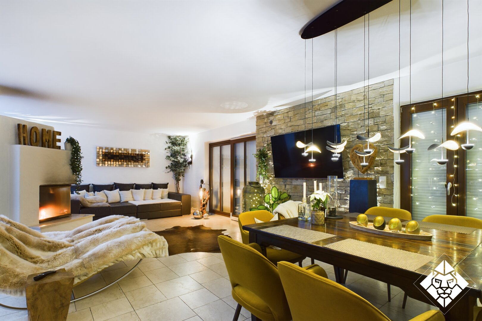 Die klare Linienführung im toskanischen Stil, kombiniert mit Naturstein, Holz und lichtdurchfluteten Übereck-Fenstern, schafft ein Ambiente, das gleichermaßen repräsentativ wie wohnlich wirkt. Ein überdachter Außensitz lädt dazu ein, die immer wärmer werdenden Alpen-Sommer stilvoll geschützt zu genießen. Im Winter öffnet sich der Blick auf die verschneiten Hänge, während im Sommer das satte Grün der Natur den Rahmen für Ruhe und Entspannung bildet.