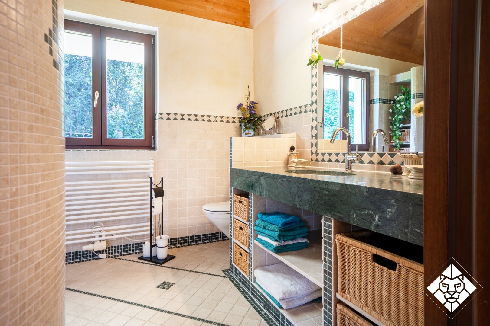 Besonders hervorzuheben ist der im Keller speziell angelegte Wellnessbereich, der als italienische Grotte nachempfunden wurde. Hier verbinden sich Steinarchitektur und stimmungsvolle Beleuchtung zu einem einzigartigen Rückzugsort. Ein Dampfbad ist bereits vorbereitet und kann mit wenig Aufwand ergänzt werden. Ergänzt wird der Bereich durch einen Weinkeller für edle Jahrgänge – ein idealer Ort, um alpine Lebensart mit mediterranem Dolce Vita zu vereinen.