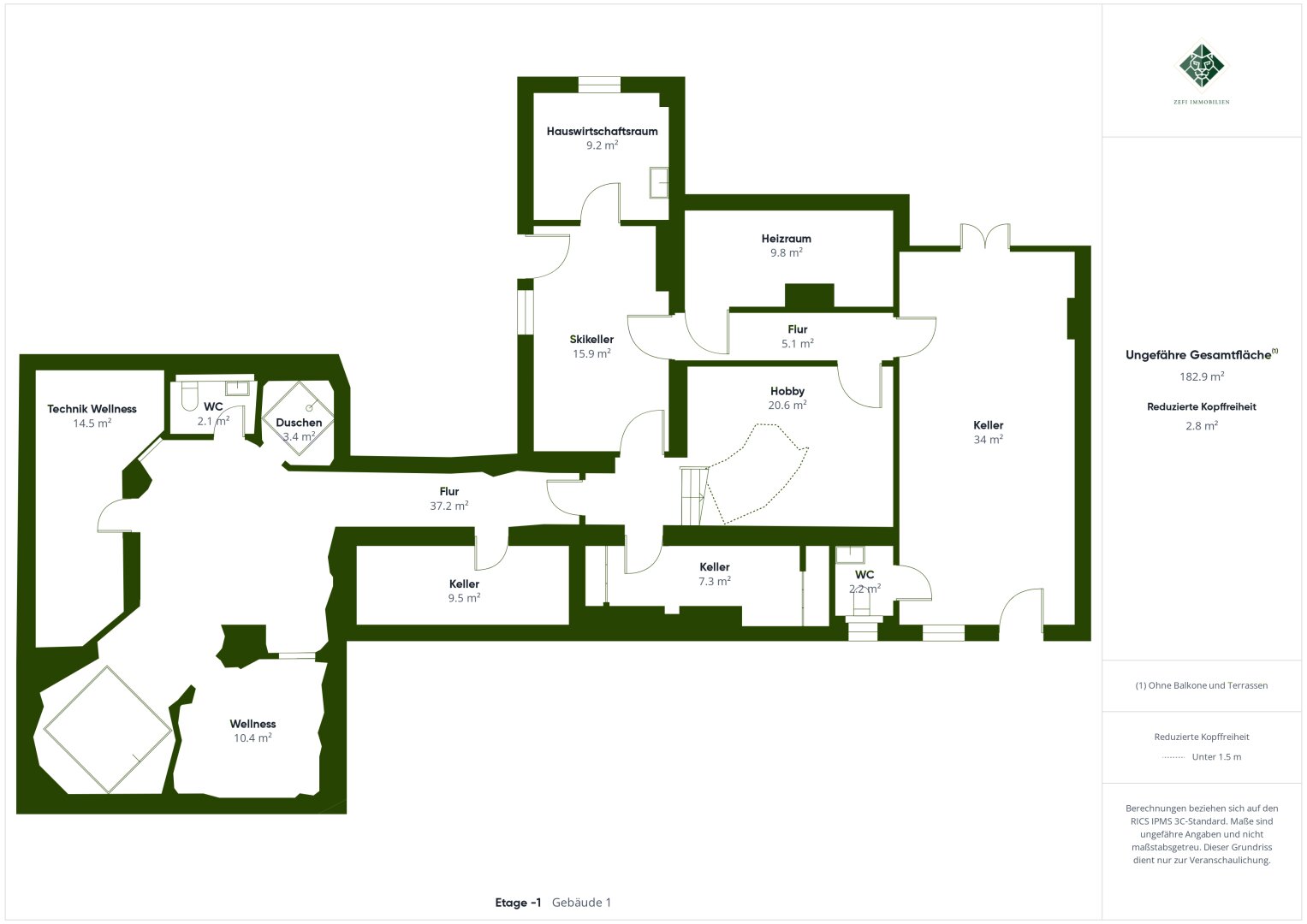 Besonders hervorzuheben ist der im Keller speziell angelegte Wellnessbereich, der als italienische Grotte nachempfunden wurde. Hier verbinden sich Steinarchitektur und stimmungsvolle Beleuchtung zu einem einzigartigen Rückzugsort. Ein Dampfbad ist bereits vorbereitet und kann mit wenig Aufwand ergänzt werden. Ergänzt wird der Bereich durch einen Weinkeller für edle Jahrgänge – ein idealer Ort, um alpine Lebensart mit mediterranem Dolce Vita zu vereinen.