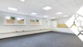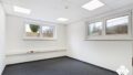 Der Raum ist mit hochwertigem Teppichboden ausgestattet. Durch die Fensterflächen strömt viel Tageslicht in den Raum. Im hinteren Bereich der Fläche befindet sich ein separates Büro mit Glaseinsatz.