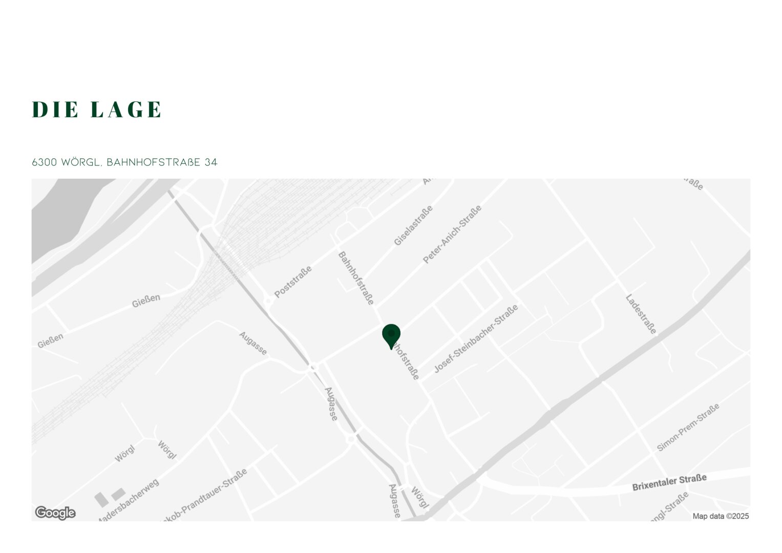 Die Gewerbefläche befindet sich in zentraler Lage an der Bahnhofstraße in Wörgl, einem der wichtigsten Verkehrs- und Geschäftsachsen der Stadt. Die Bahnhofstraße zählt zu den frequentiertesten Straßen in Wörgl und bietet eine hervorragende Sichtbarkeit sowie eine starke Kundenfrequenz – beste Voraussetzungen für eine gewerbliche Nutzung.